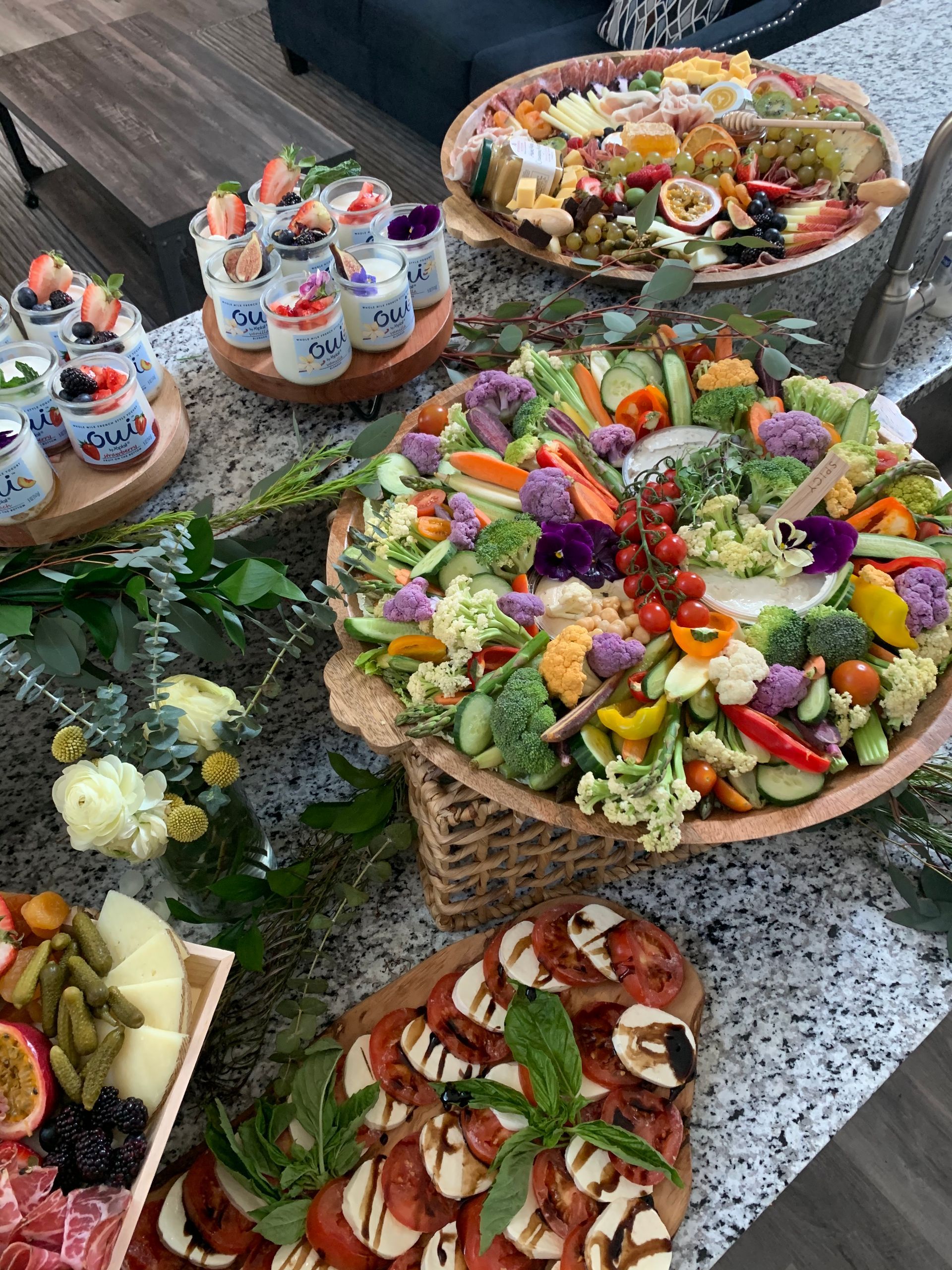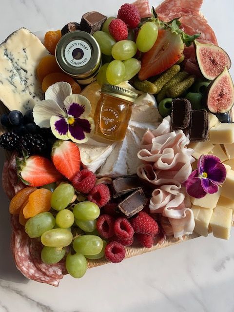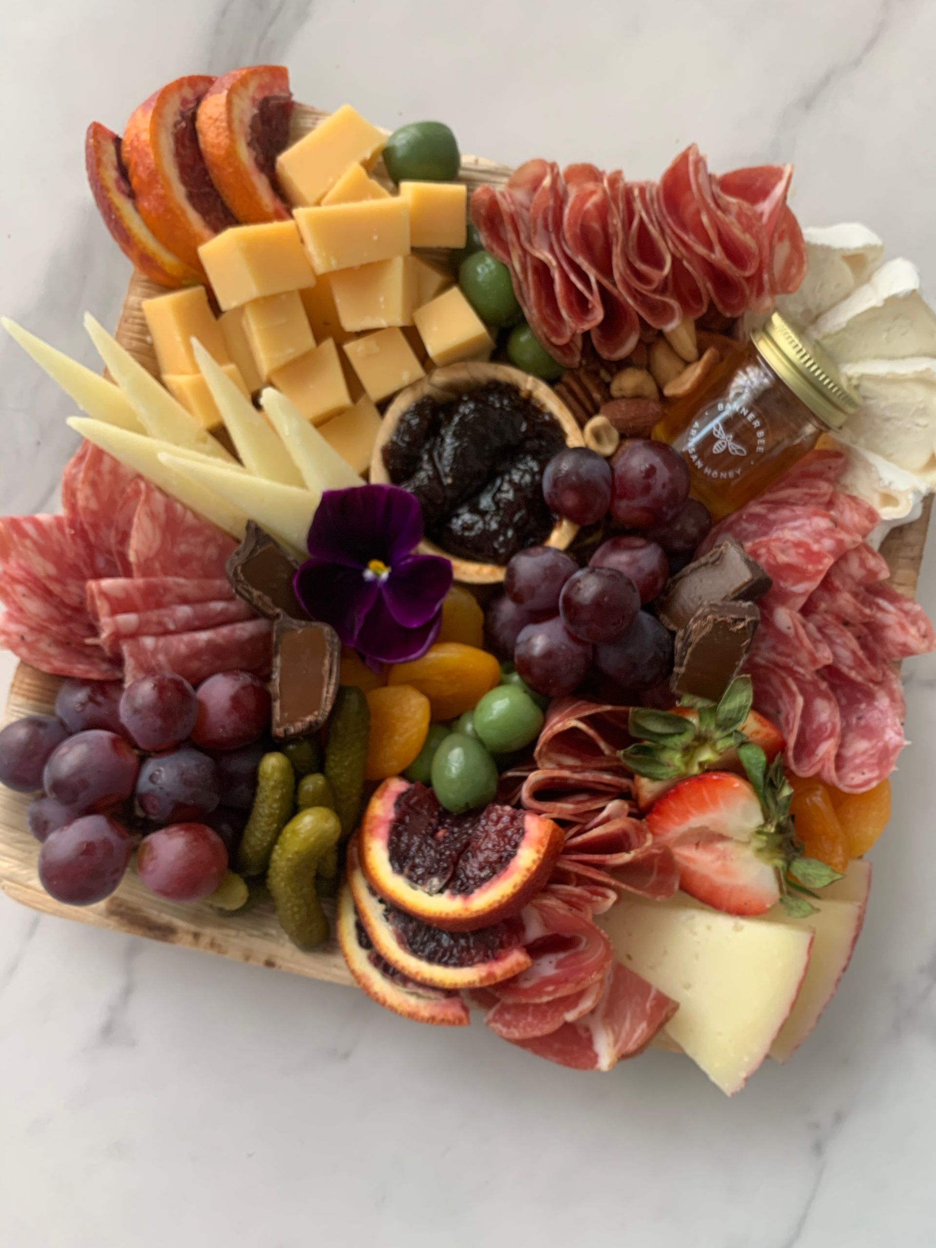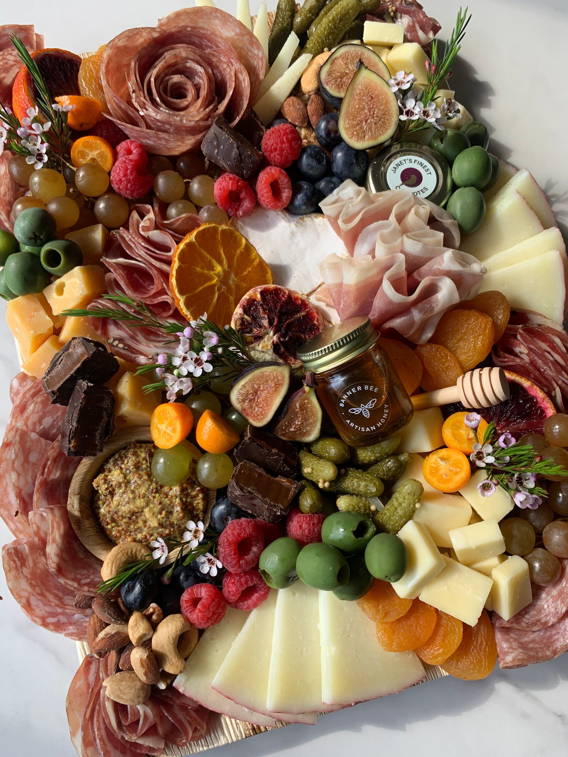 5 premium cheeses, 5 premium charcuterie meats, local honey, jam, mustard, season fruit, and artisan crackers served on the side.