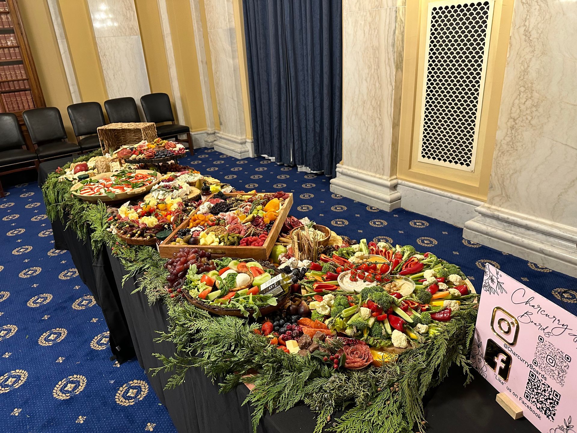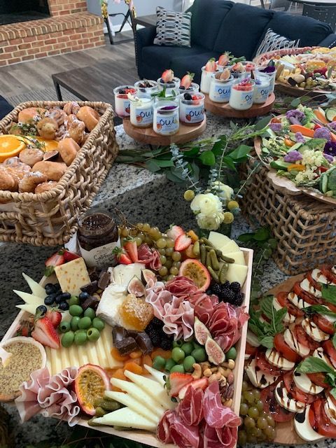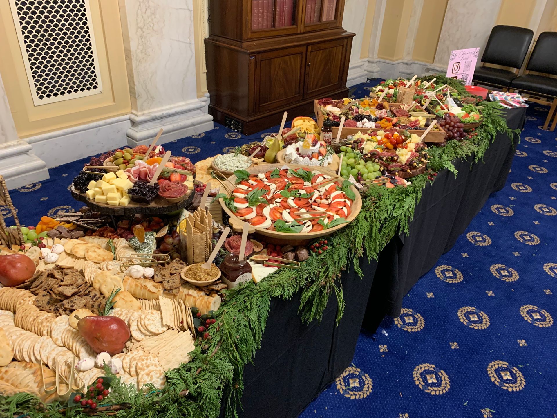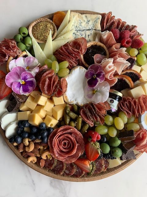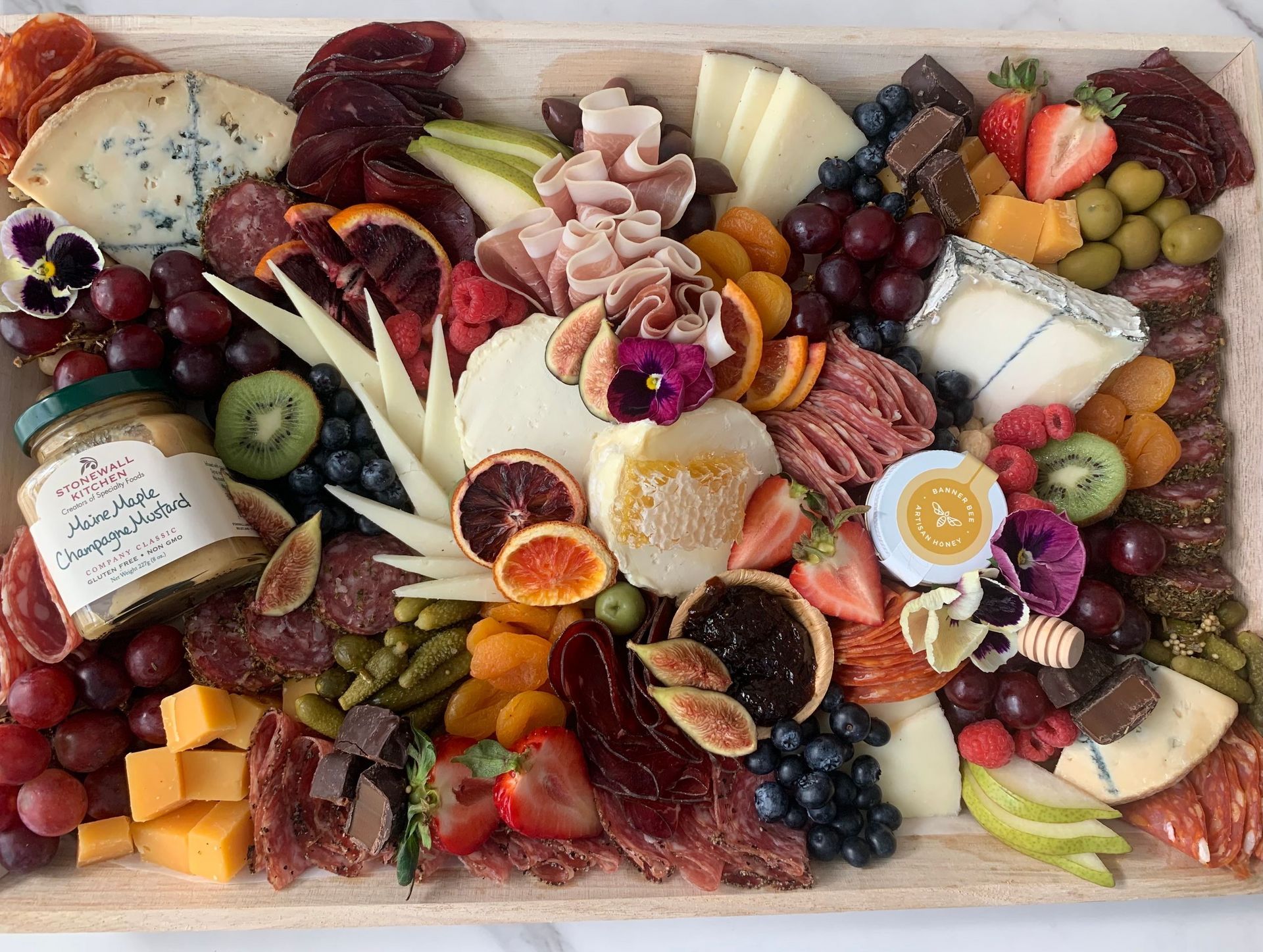 6 cheeses - 3 out of 6 are local cheeses from Chappel's Creamery in Easton, MD (Chappel's Chesapeake Brie, Chappel's Bay Blue, and Chappel's Cheddar), 4 charcuterie meats, seasonal fruit, 2 seasonal jams, local honey and crackers served on the side.